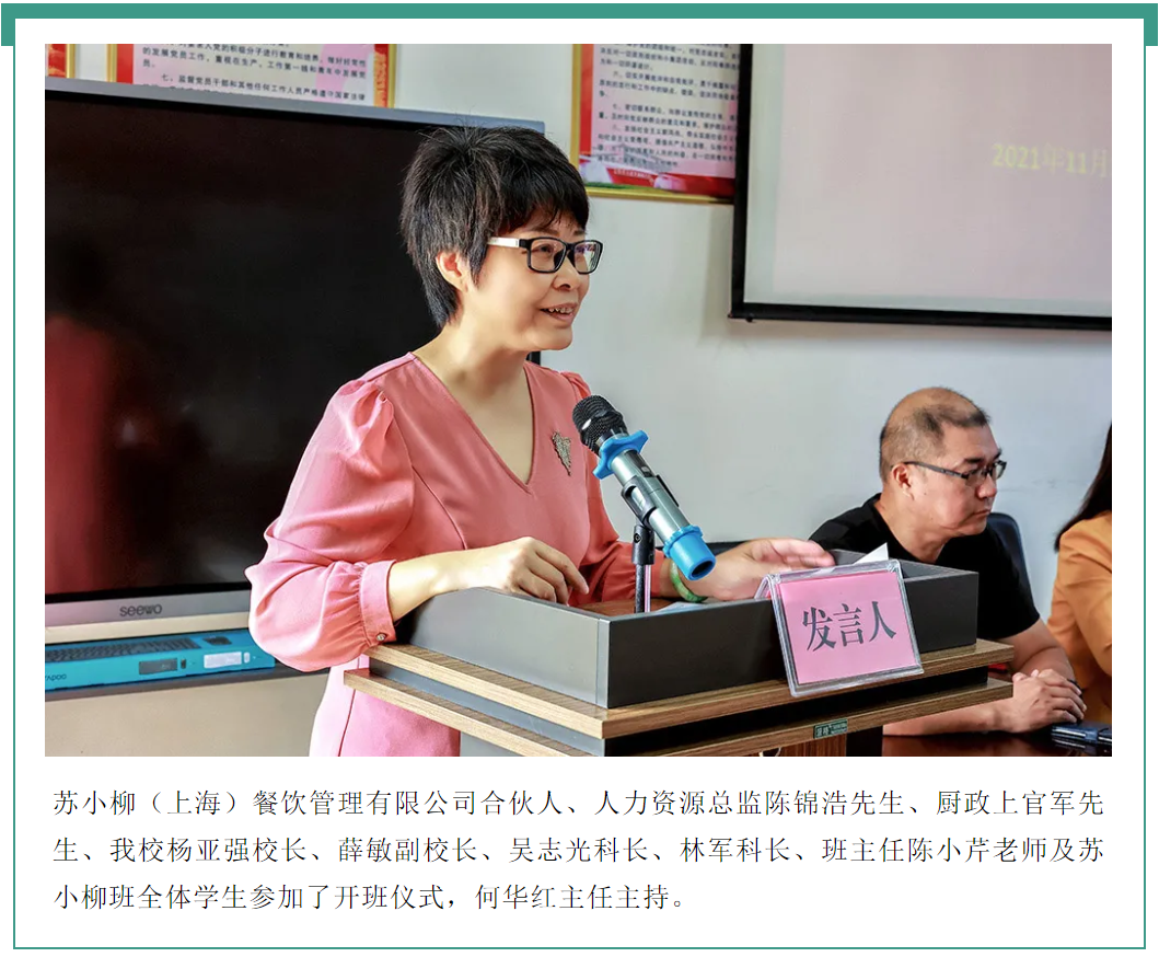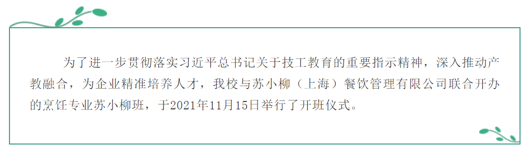 苏小柳(上海)餐饮管理有限公司与我校已经长期合作,建立了互惠互赢的良好合作关系,今天苏小柳班的开办是我校进一步深化校企合作的新举措,希望通过产教融合,强强联手,积极探索从课堂到企业,从理论到实践的技能人才培养模式,不断提高教学质量,为社会培养更多高质量的技能人才。