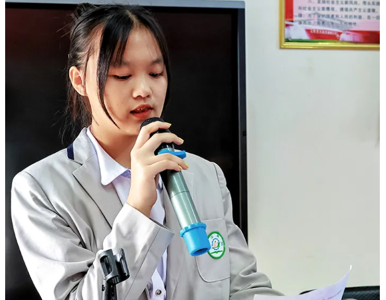 苏小柳班全研慧同学代表全体同学表态:我们很幸运地成为湛江商校首届苏小柳班学生,在未来两年,我们将严格遵守商校和苏小柳的各项规章制度,遵循老师和大师们的教导,刻苦学习,苦练技能,积极锻炼身体,主动参加实践,力争在校做一名优秀的商校学生,两年后到上海做一名优秀的苏小柳人!