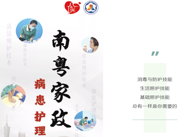 2021年“南粤家政”培训课程资源以《病患护理职业技能培训课程标准》及广东省“南粤家政”工程培训教材《金牌病患护理技能》为依据,结合医护服务行业实际岗位需求进行开发。内容涵盖消毒与防护、生活照护、基础照护技能中使用率高、实用性强的40个技能项目,具有全面性、专业性、适用性等特点。