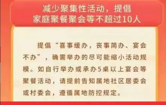二、减少流动和聚集。春节期间,请广大市民近期不要前往有本土疫情报告地区所在地市旅行及出差。确需前往的,请务必提前向所在社区(村)和工作单位报备。省外旅游、出差返湛后,建议主动做一次核酸检测,并自我观察14天,做好健康监测。减少聚集,尽量不参与聚集性堂食和宴请等。