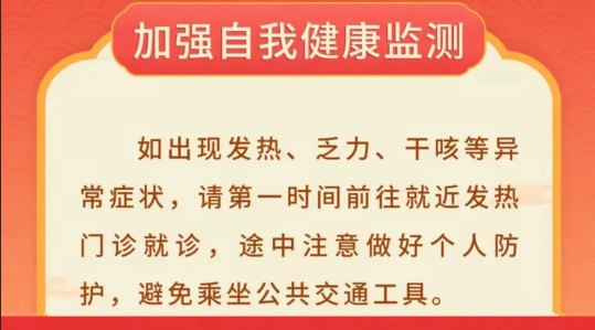 四、一旦出现发热、干咳、乏力、嗅觉味觉减退、鼻塞、流涕、咽痛、结膜炎、肌痛、腹泻等不适症状时,应立即报告所在居委(村委)、所在单位或所住酒店,及时就近至发热门诊就诊,并主动告知医生自己的旅行史,就诊过程中请做好个人防护并不得乘坐公共交通工具。