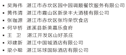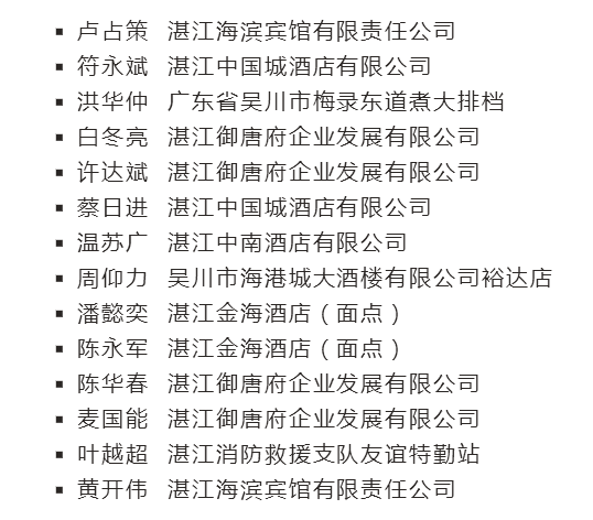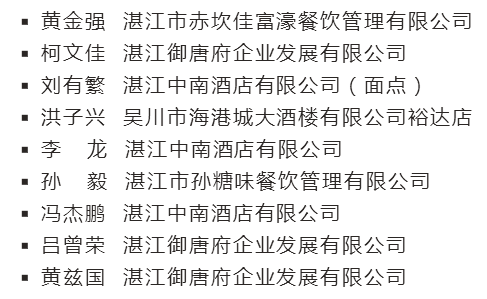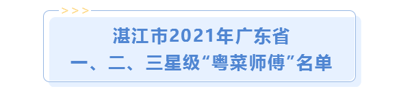 广东省三星级“粤菜师傅”(7人)广东省二星级“粤菜师傅”(14人)广东省一星级“粤菜师傅”(9人) 希望获得星级“粤菜师傅”称号的个人和单位继续发扬工匠精神发挥示范带动作用推动湛江市“粤菜师傅”工程高质量发展