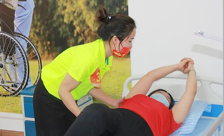 比赛按育婴员、家政服务员、养老护理员、医疗护理员四大项目分组,参赛选手轮流上场,在规定时间内展示婴儿生活照料、家居收纳管理、老人康复管理、病人清洁照护等技能。“我们现在先慢慢把双手竖立起来,交叉,再往左边一点,慢慢来……”养老护理组,实操考核采用现场真人模拟老年人照护情境的方式进行,参赛选手温柔与老人沟通,让老人配合自己做好基础的护理项目,评委根据选手现场实操表现进行评分。
