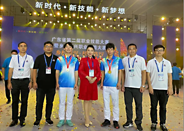 ▲花学建(右3)勇夺广东省第二届职业技能大赛暨乡村振兴职业技能大赛电工项目金牌