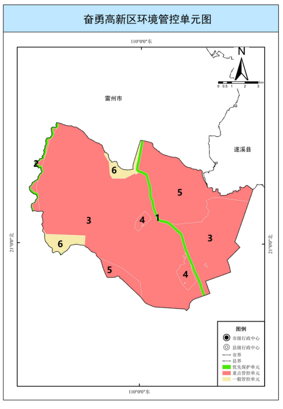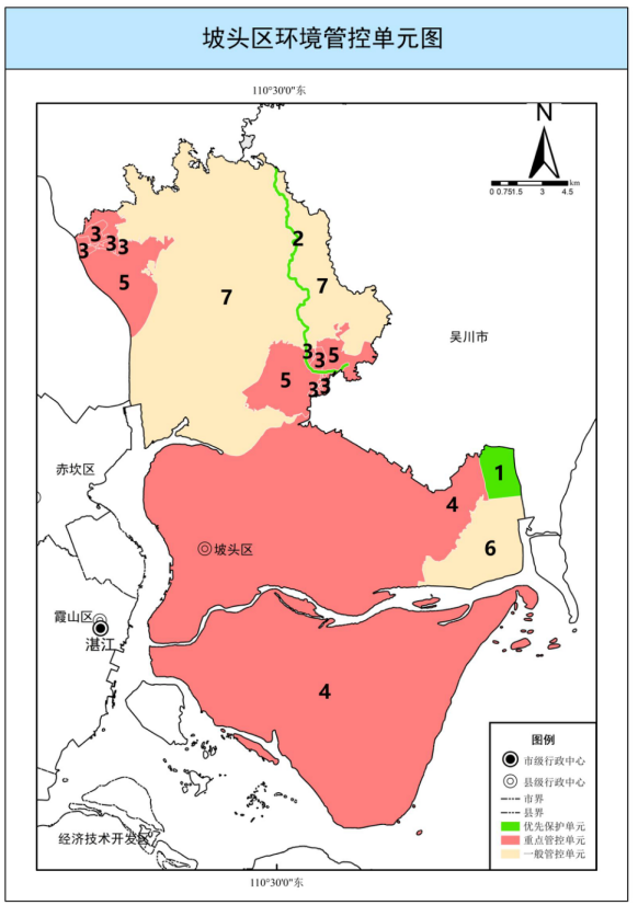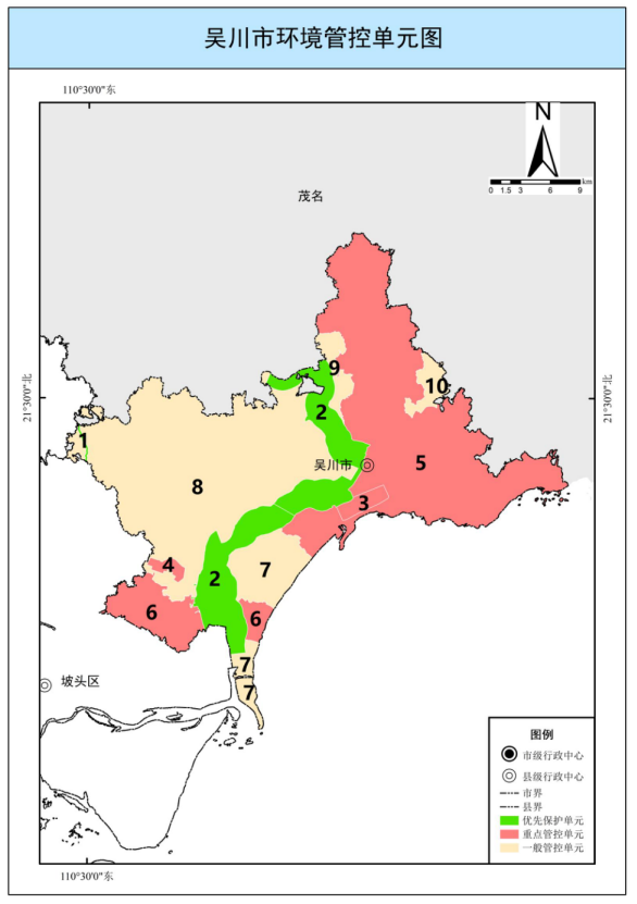 全市共划定陆域环境管控单元89个,其中,优先保护单元23个,面积563.13平方公里,占全市陆域国土面积的4.25%,主要涵盖生态保护红线、一般生态空间、饮用水水源保护区、环境空气质量一类功能区等区域,主要分布在廉江北部丘陵山地生态屏障,雷州半岛中部林地生态屏障,以及南渡河、雷州青年运河、鉴江干流、鹤地水库、东吴水库、龙门水库、大水桥水库等饮用水水源保护区,与市域生态安全格局基本吻合;重点管控单元40个,面积5193.66平方公里,占全市陆域国土面积的39.15%,主要包括工业集聚、人口集中和环境质量超标区域;一般管控单元26个,面积7507.77平方公里,占全市陆域国土面积的56.60%,为优先保护单元、重点管控单元以外的区域。