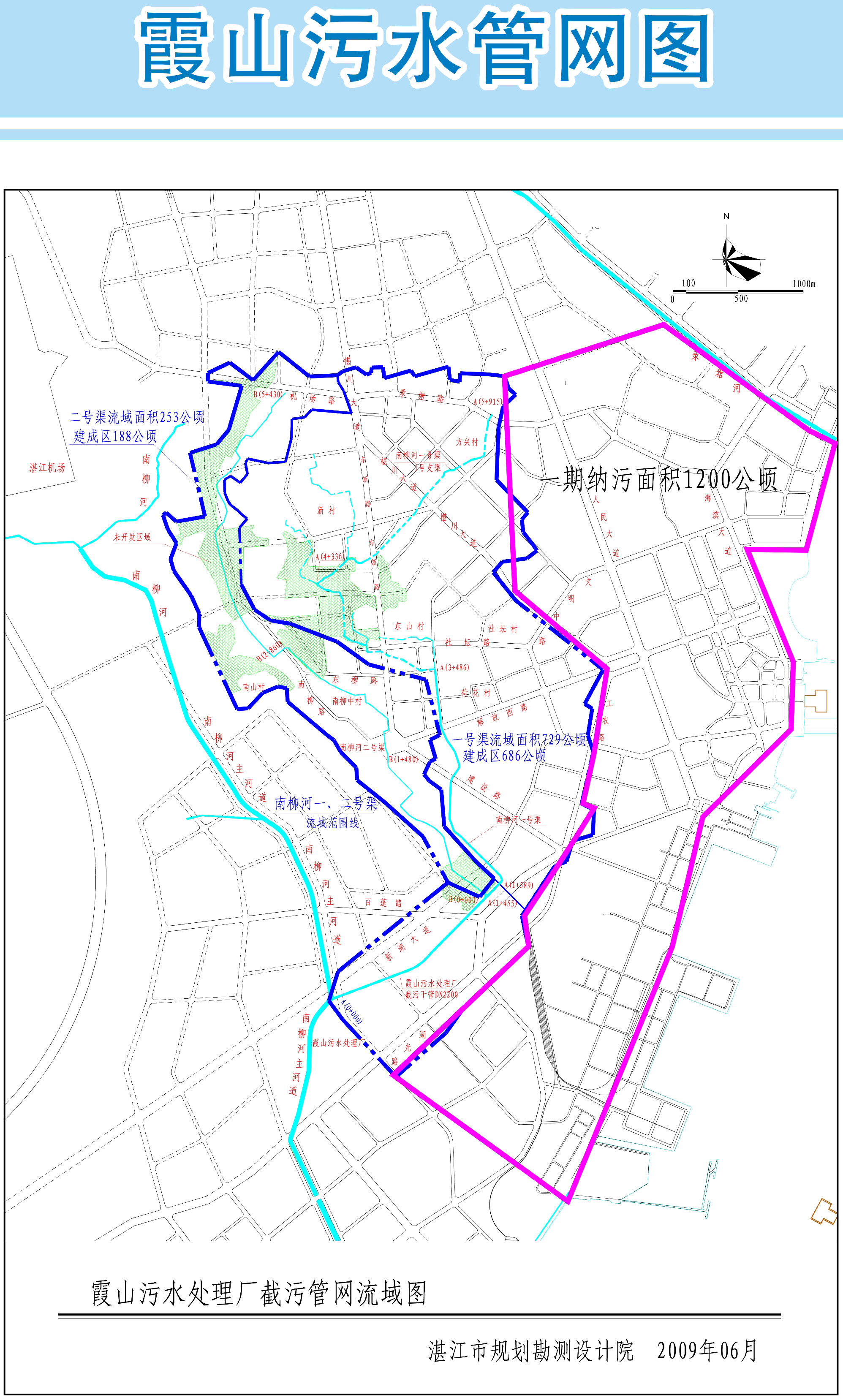 霞山水质净化厂一期管网起点位于海滨大道与绿塘河交汇处,终点至南柳河一号渠进入霞山水质净化厂,主管网全长约7.8公里。二期新增纳污范围为菉塘路、机场路以南和人民大道以西的南柳河流域,合计纳污面积约2182公顷,服务人口约50万,霞山区城区的市政污水基本得到整治。服务区内的污水通过污水专管以重力自流至厂区,经水泵提升进行生化处理,处理后的出水向西排入南柳河,最后流入湛江港湾。