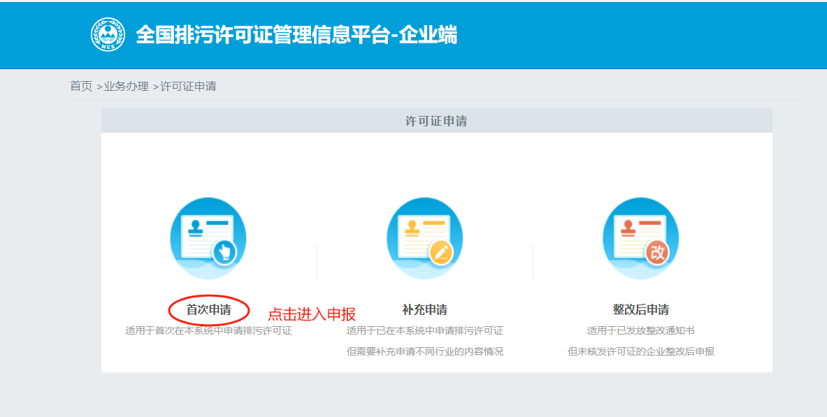 1.按照排污许可证申请与核发技术规范等有关要求,在国家平台“许可证申请”模块上填报相关信息,并上传相关资料附件,在系统中提交排污许可证申请表。实行重点管理的排污单位在提交排污许可申请表前,应当将承诺书、基本信息以及拟申请的许可事项通过国家平台等便于公众知晓的方式向社会公开,公开时间不得少于5个工作日。