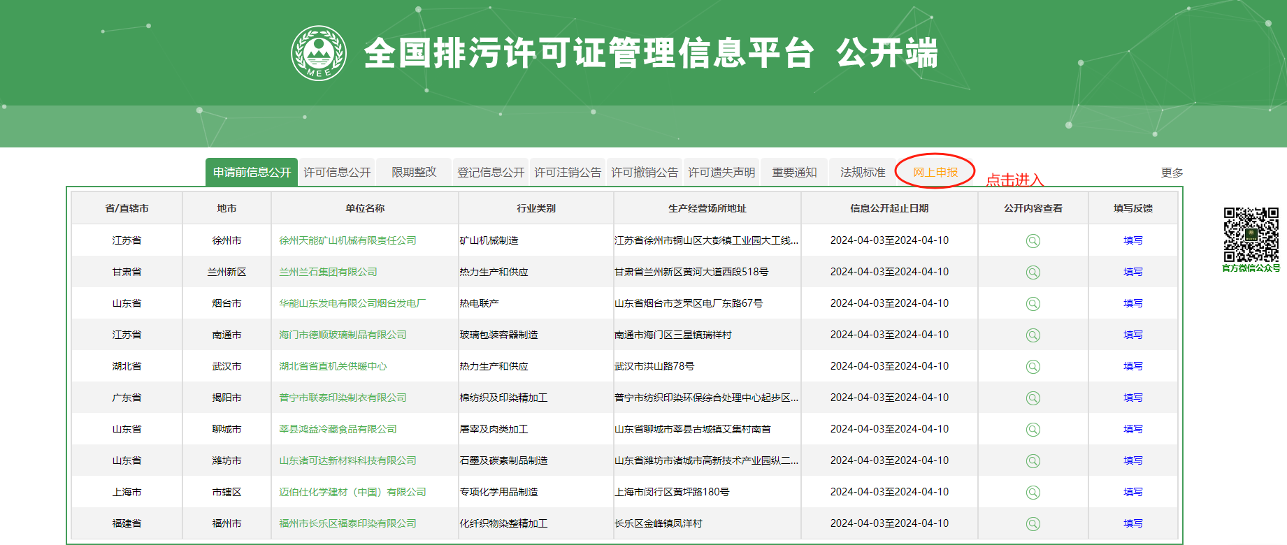 排污单位登录全国排污许可证管理信息平台-公开端(网址同上),点击导航栏“网上申报”栏目,进入“国家排污许可证管理信息平台-企业端”页面注册,并用此账户登录,进入“业务办理-许可证申请”模块。