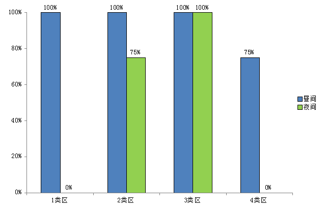 2015年上半年全市15个功能区声环境监测达标率分别为:1类区昼间为100%,夜间为0%;2类区昼间为100%,夜间为75.0%;3类区昼间为100%,夜间为100%;4类区昼间为75.0%,夜间为0%。
