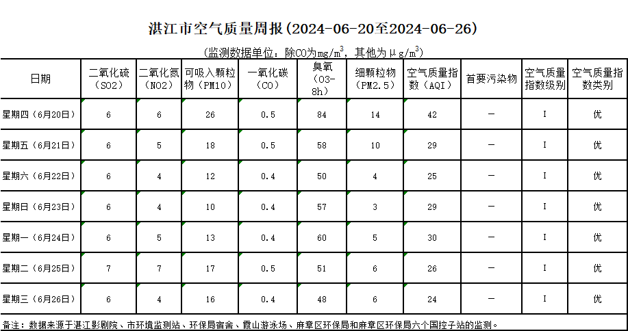 湛江市空气质量周报(2024-06-20至2024-06-26)