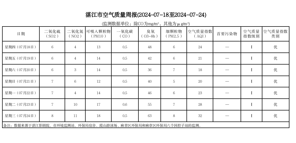 湛江市空气质量周报(2024-07-18至2024-07-24)