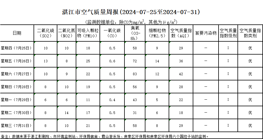 湛江市空气质量周报(2024-07-25至2024-07-31)