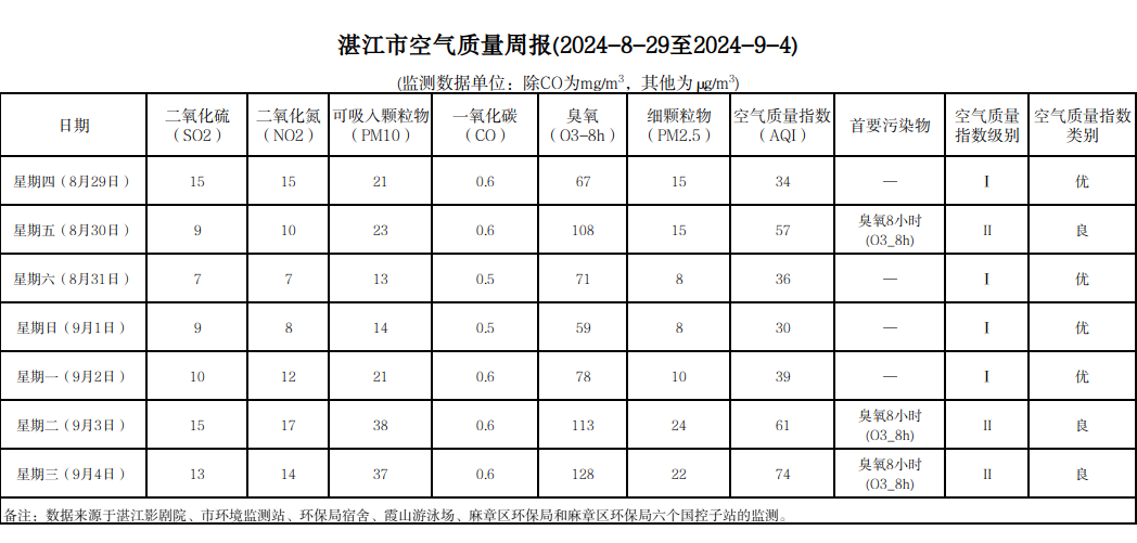 湛江市空气质量周报(2024-8-29至2024-9-4)