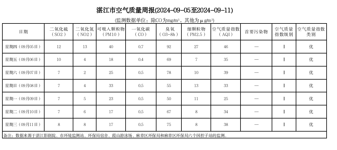 湛江市空气质量周报(2024-09-05至2024-09-11)