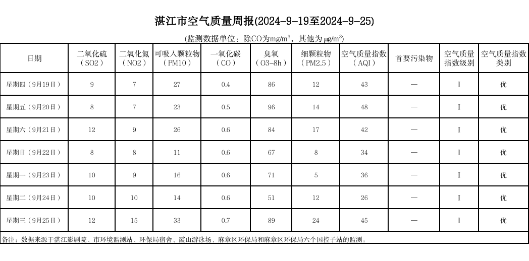 湛江市空气质量周报(2024-9-19至2024-9-25)