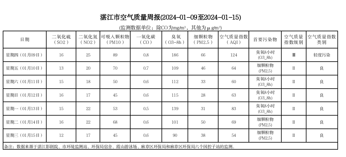 湛江市空气质量周报(2024-01-09至2024-01-15)