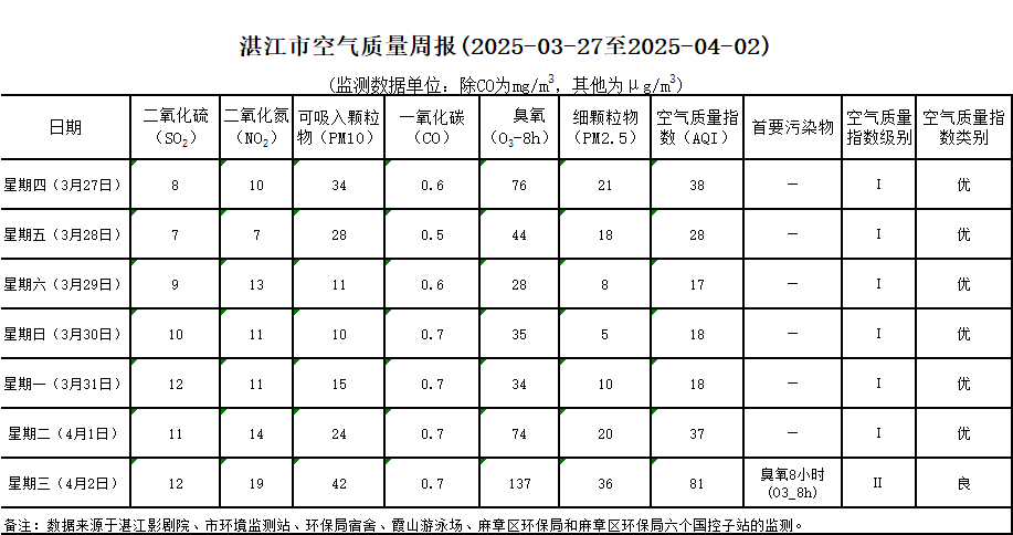 湛江市空气质量周报(2025-03-27至2025-04-02)