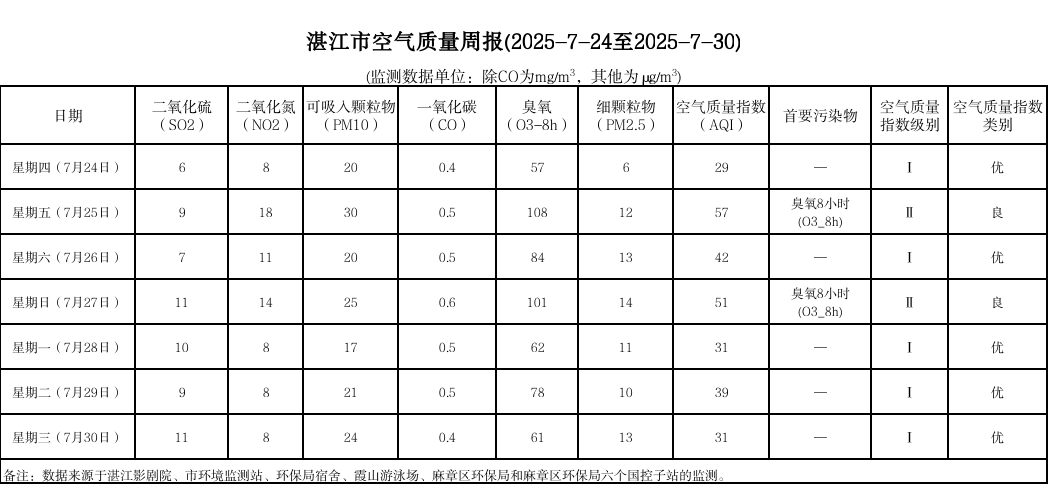 湛江市空气质量周报(2025-07-24至2025-07-30)