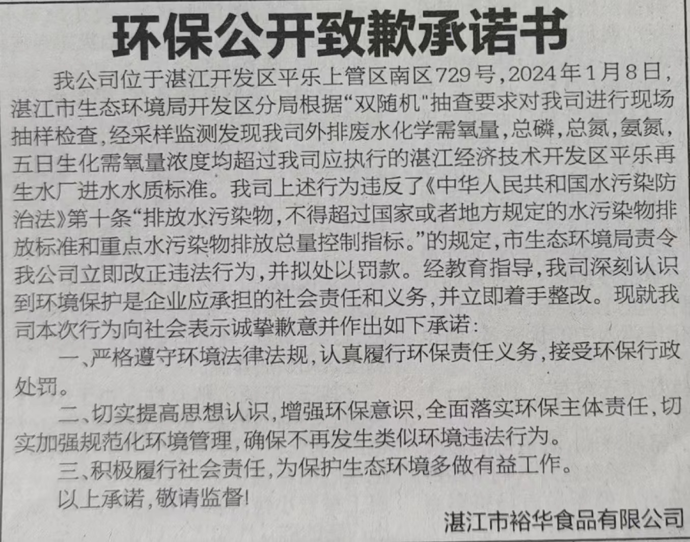 湛江市裕华食品有限公司于2024年3月7日在湛江日报公开道歉,作出履行行政处罚决定和环保守法承诺。