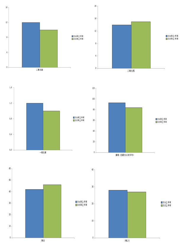 2015年上半年湛江市二氧化硫、二氧化氮、一氧化碳、臭氧(日最大8小时平均)、PM10、PM2.5浓度对比情况见图1。