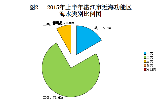 2015年上半年,覆盖整个湛江市近岸海域的12个功能区监测点位水质均达到相应的水质目标要求,水质总体良好,水质类别以二类海水为主,其中一类海水占16.7%、二类海水占75.0%、三类海水占8.3%,没有四类和劣四类海水水质功能区。与去年同期相比,湛江市近岸海域功能区水质保持稳定。