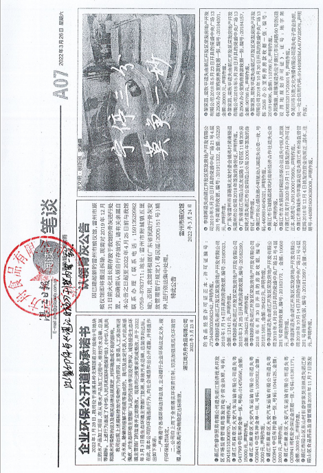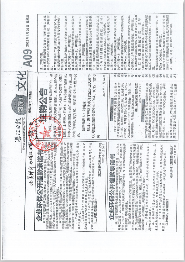 吴川市龙达塑料复合彩印厂于2022年10月14日在湛江日报A11版登报,公开道歉并做出守法承诺。