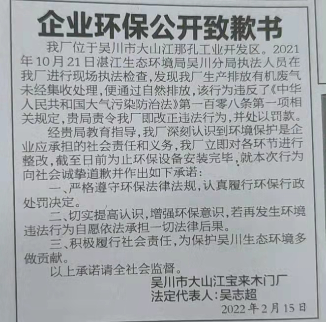吴川市大山江宝来木门厂于2022年2月15日在湛江日报公开道歉,作出履行行政处罚决定和环保守法承诺。