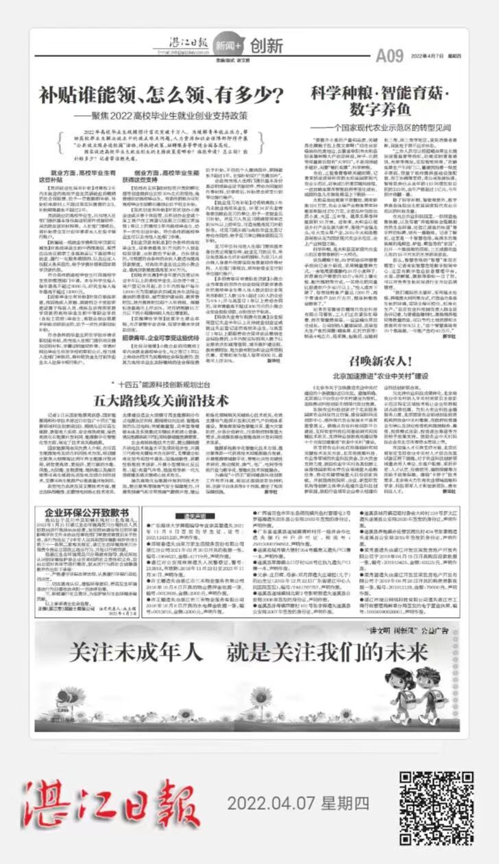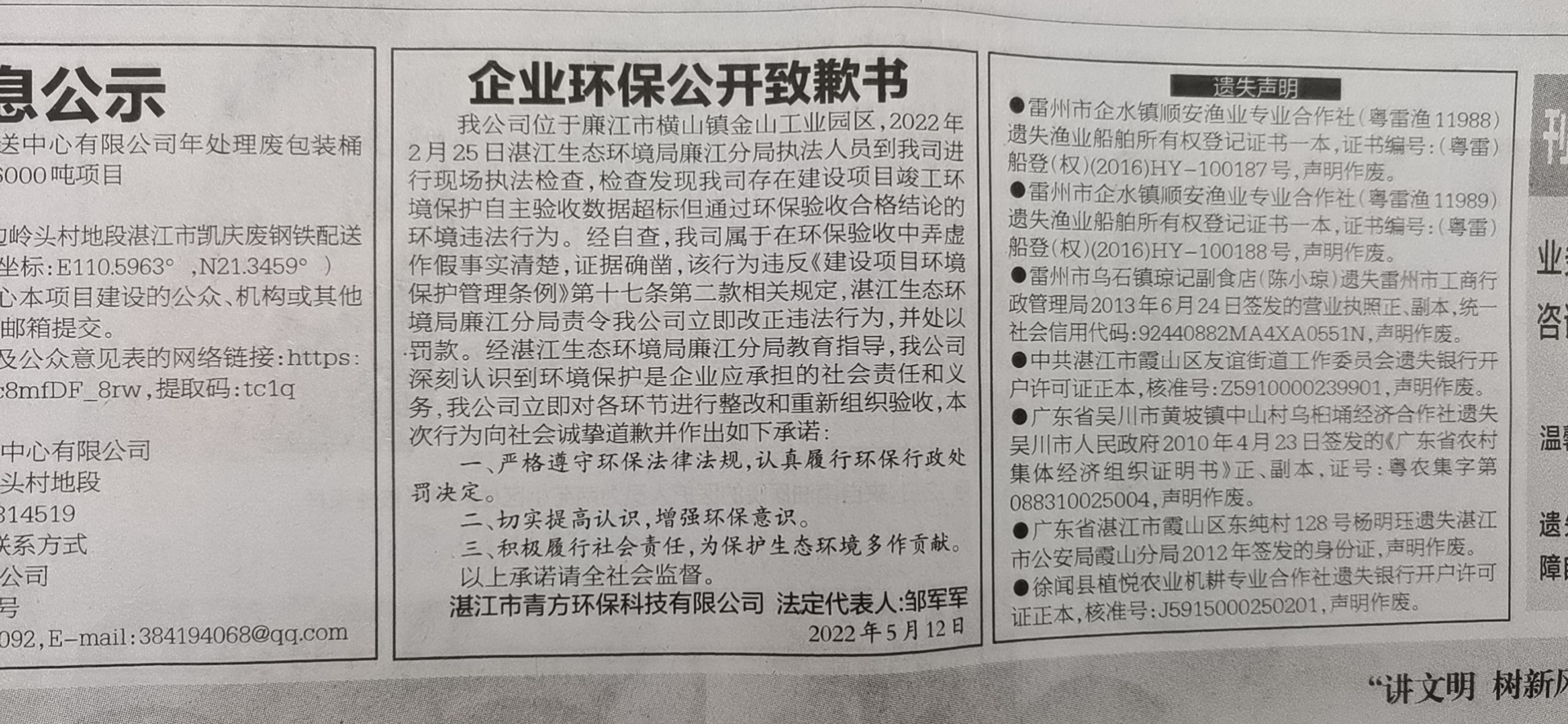 湛江市青方环保科技有限公司于2022年5月12日在湛江日报公开道歉并作出守法承诺。