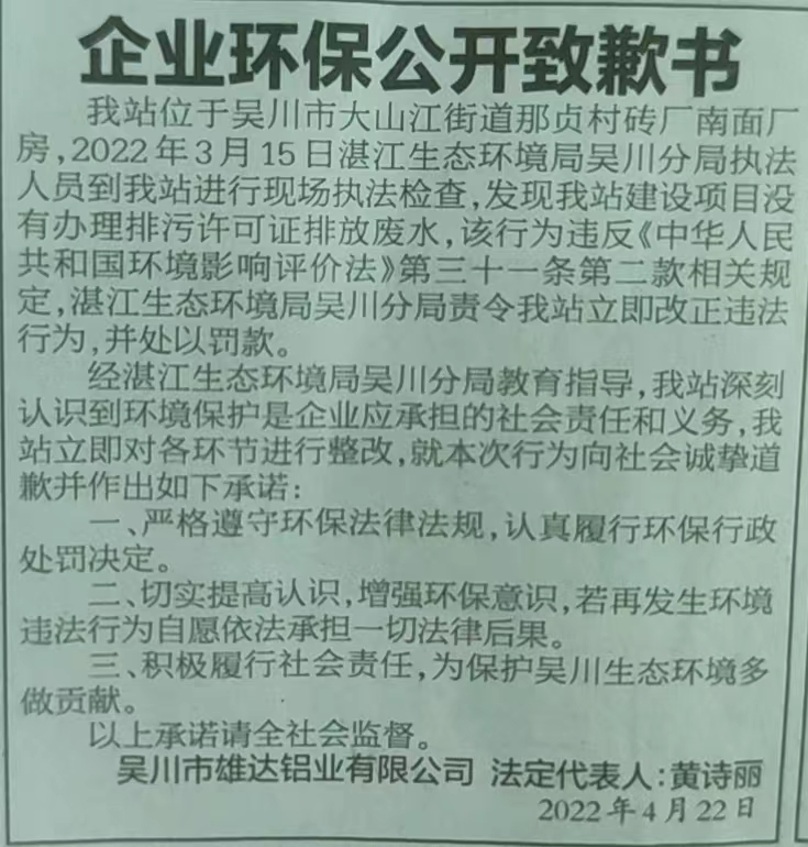 吴川市雄达铝业有限公司于2022年4月22日在湛江日报公开道歉并作出守法承诺。