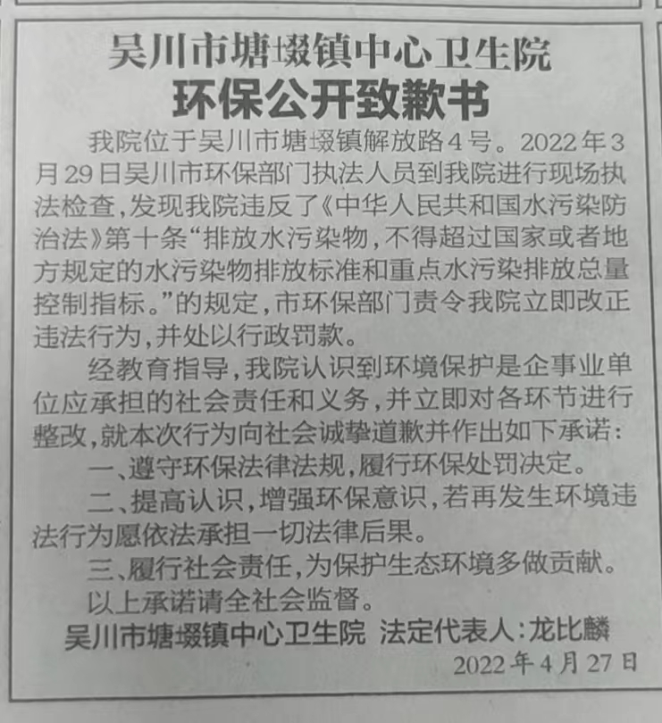 吴川市塘㙍镇中心卫生院于2022年4月27日在湛江日报公开道歉并作出守法承诺。
