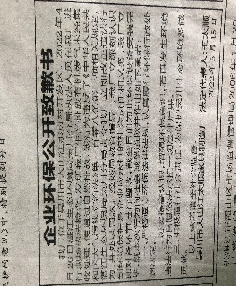 吴川市大山江太顺家具制造厂于2022年5月15日在湛江日报公开道歉并作出守法承诺。