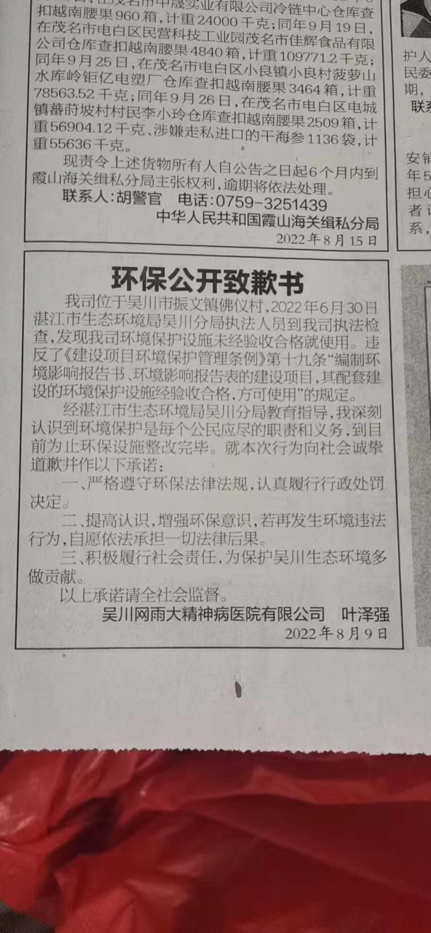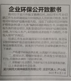 吴川网雨大精神病医院于2022年8月11日在《湛江日报》A09版公开道歉并作出环保守法承诺。