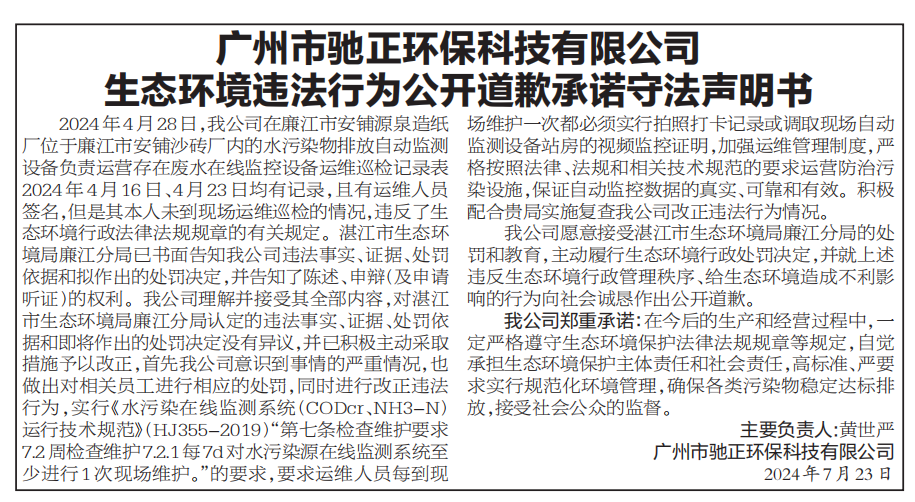 广州市驰正环保科技有限公司于2024年7月23日在《湛江日报》公开道歉,作出履行行政处罚决定和环保守法承诺。