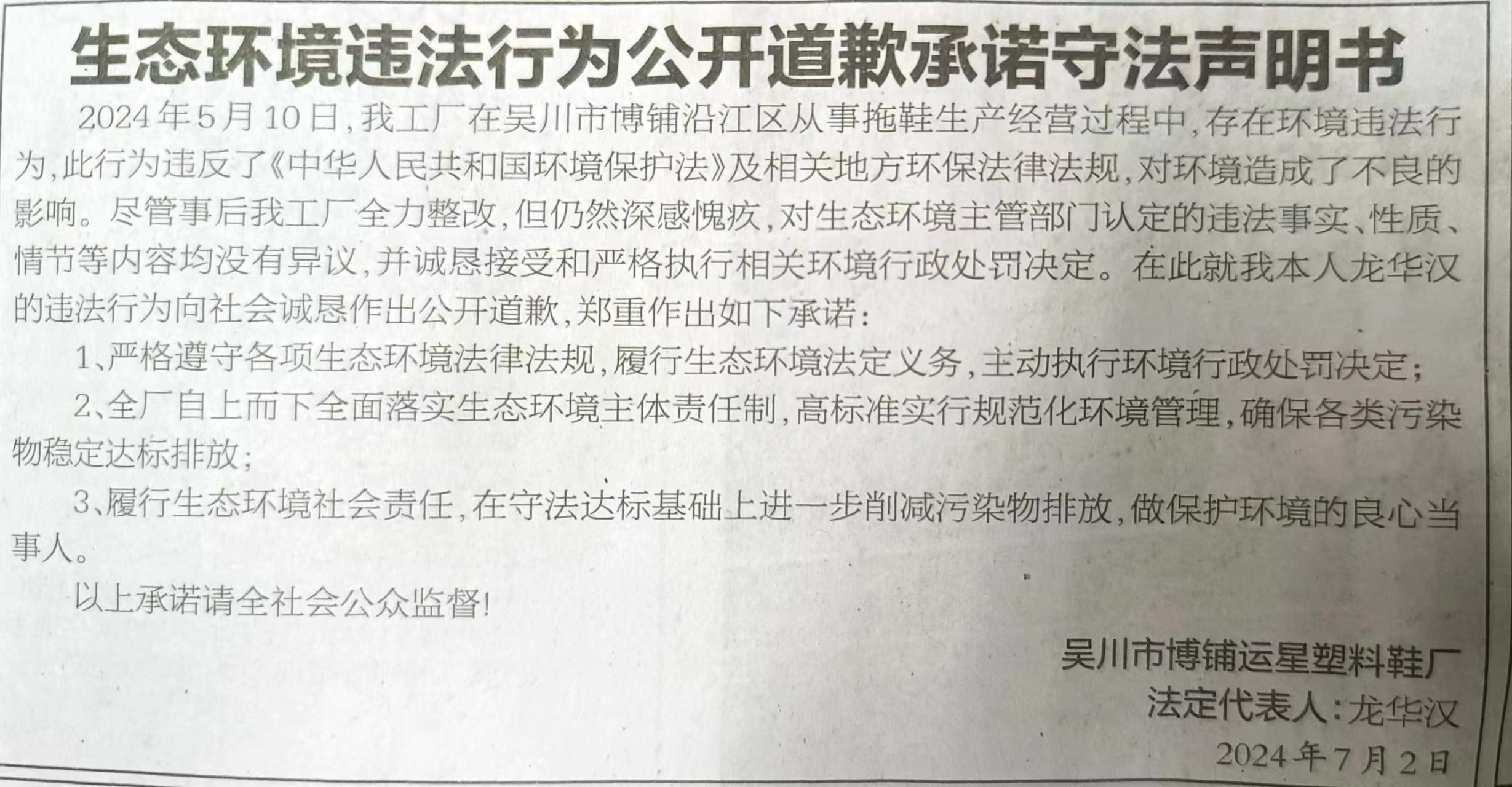 吴川市博铺运星塑料鞋厂于2024年7月2日在《湛江日报》公开道歉,作出履行行政处罚决定和环保守法承诺。