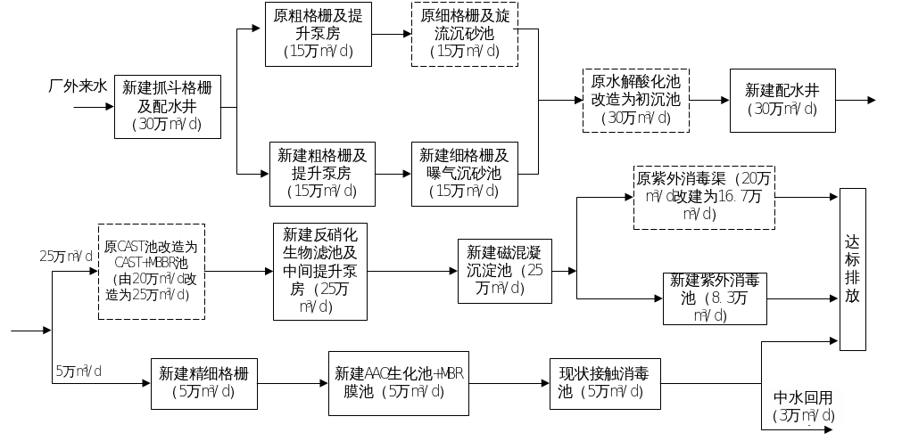 (功能简介:AAO生化池负责去除污水中BOD5、COD等污染物,同时进行生物脱N除P。膜生物反应器(MBR)工艺是先进的废水处理技术,在传统的悬浮生长活性污泥处理系统中采用低压膜进行固/液分离从而代替传统的二沉池。与传统二沉池相比,其最大的优势在于:固液分离的效果不依赖混合液悬浮固体的浓度或者其沉降特性。因此,膜—生物反应器(MBR)可以维持很高的MLSS。)