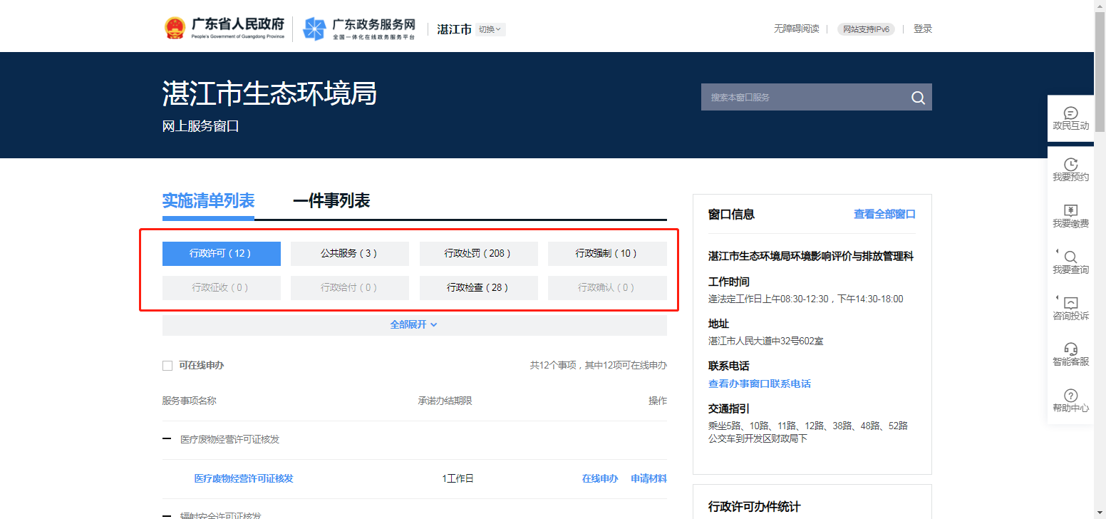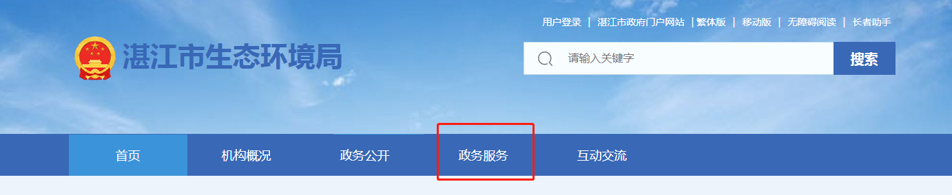 2、登录后,点击“湛江市生态环境局”官网主页的“政务服务”选项,进入业务界面。