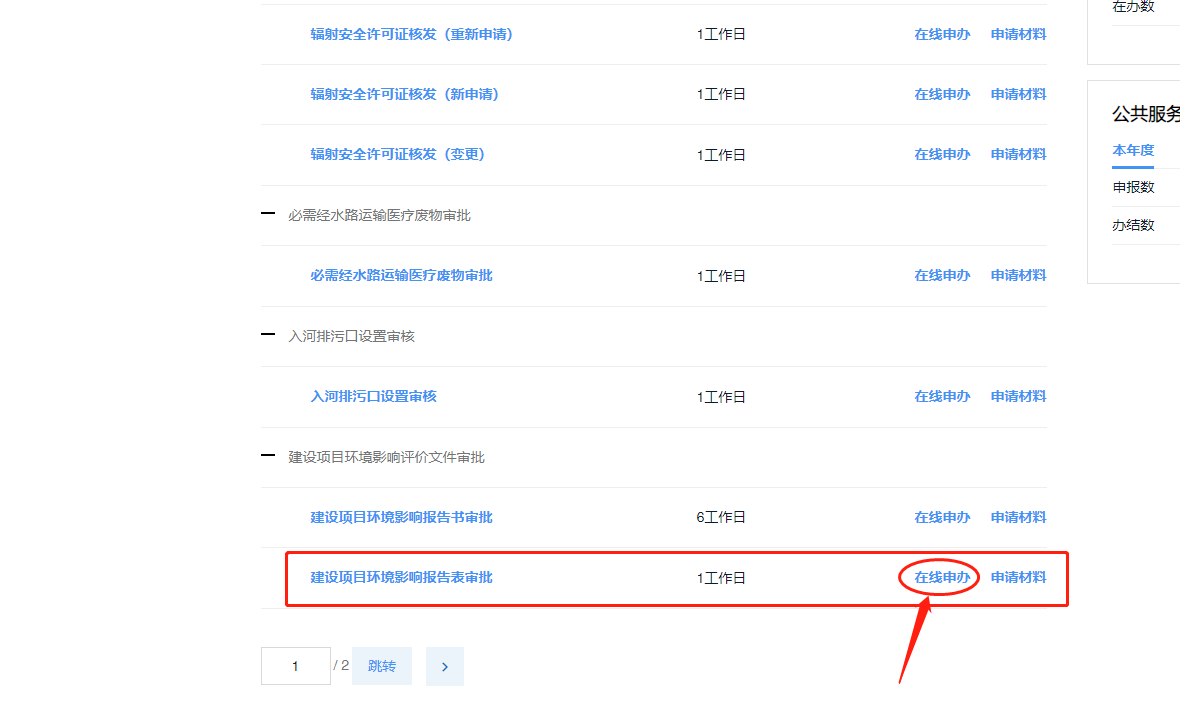 4、选择建设项目环境影响评价文件审批,选择对应的报告书/报告表类别申报,点击“在线申办”,进入办理界面。