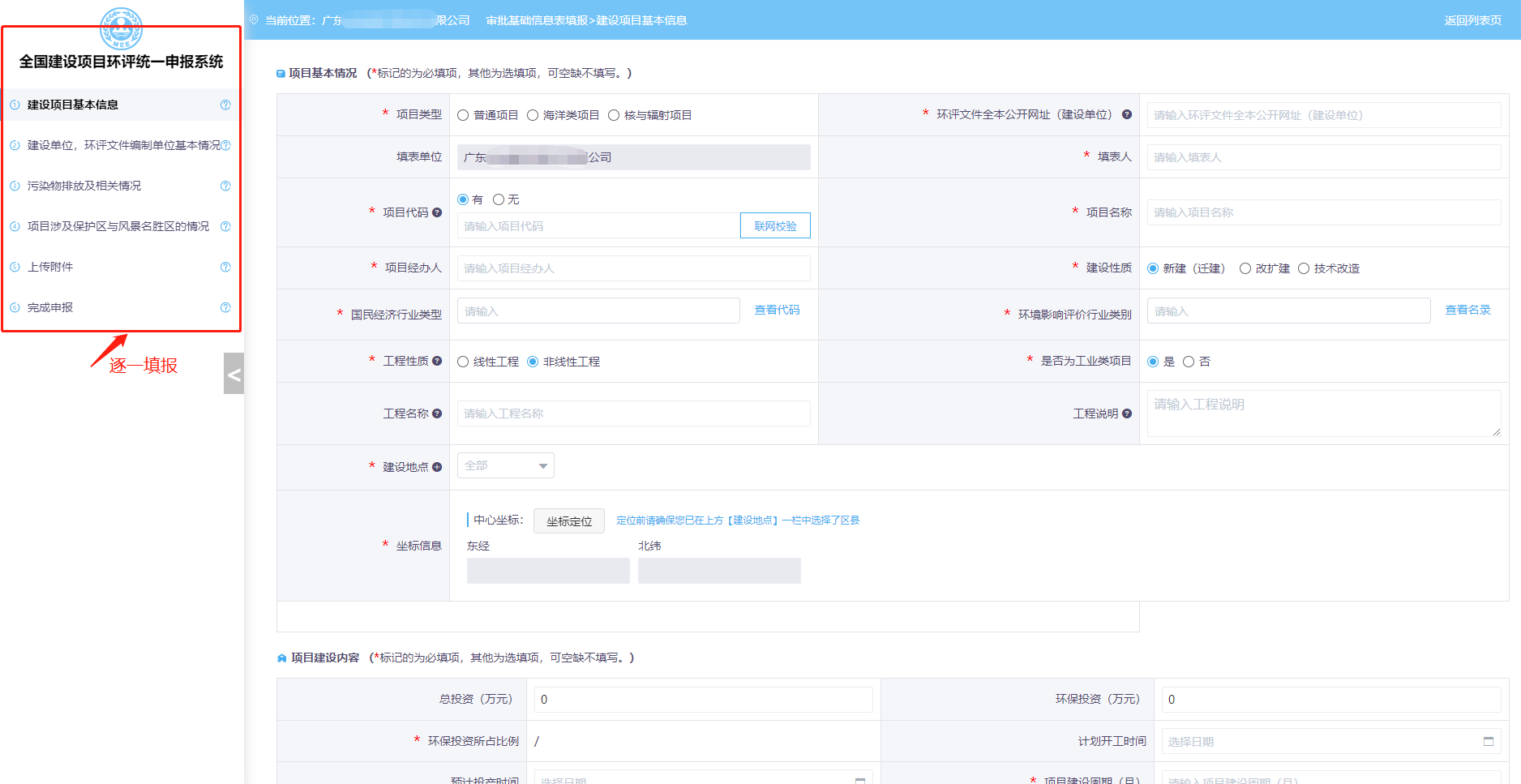 6、跳转到当前界面,根据左上角信息表内容逐一填报。
