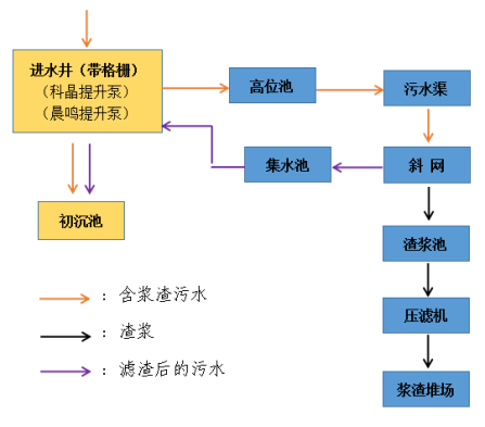 湛江晨鸣公司含浆渣污水通过排水管汇集到进水井,经过提升泵提升到斜网捞浆处,经水渠下到斜网进行浆渣及废水分离,废水返回到集水井进入污水处理厂,浆渣通过收集沟收集,经泵进入压滤机脱水收集外运。