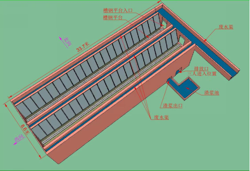 综合斜网、集水池现场勘察情况,斜网捞浆及集水池外形构造及相关尺寸数据汇总形成整体情况如图7所示,剖面图如图8所示。