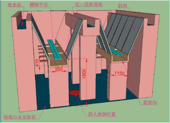 集水池为密闭空间且长时间封闭,提升泵持续泵入废水,含浆渣废水经斜网过滤,浆渣覆盖斜网,流淌废水在斜网面形成水层膜,池内废水淋洒。由于事发当天天气炎热,集水池中充斥大量蒸气,氧气含量不足且闷热潮湿。