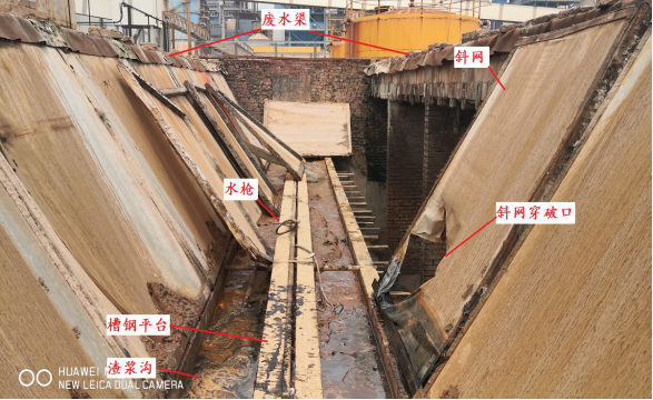 经现场勘查和气体检测,浆渣收集区域作业通道及集水池未检测出有毒气体,在旁边未发生事故的集水井检测出微量氨气。事发时纪某亮在通道进行斜网清洗作业,作业及通道平台宽0.35米,渣浆沟深0.4米,沟面敞开无防护,通道没有设置防护栏。纪某亮身高1.71米,现场斜网穿破口中心位于斜网边框上方0.5米处,由此可以排除纪某亮从槽钢平台或渣浆沟直接跌落集水池的可能;渣浆沟深0.4米,技术组推断,纪某亮在西侧起第6块斜网处脚踏空踩入渣浆沟、身体失去平衡后侧倒落入积水池。斜网穿破情况如图13所示。
