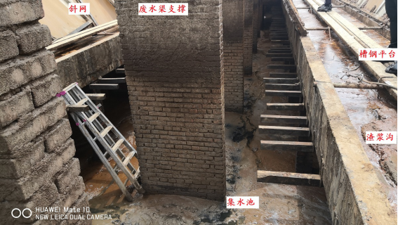 一是清洗作业通行平台由两条槽钢并排搭设而成,宽度为350mm,不符合规范要求[];二是渣浆沟下方的集水池深度为1.9米,渣浆沟未按规范要求[]在临边位置设置防护栏杆。