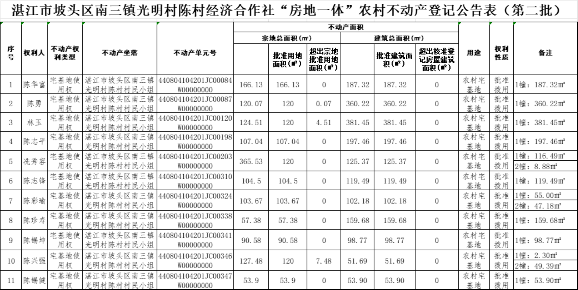 附表:坡头区南三镇光明村陈村经济合作社“房地一体”农村不动产登记公告表(第二批)