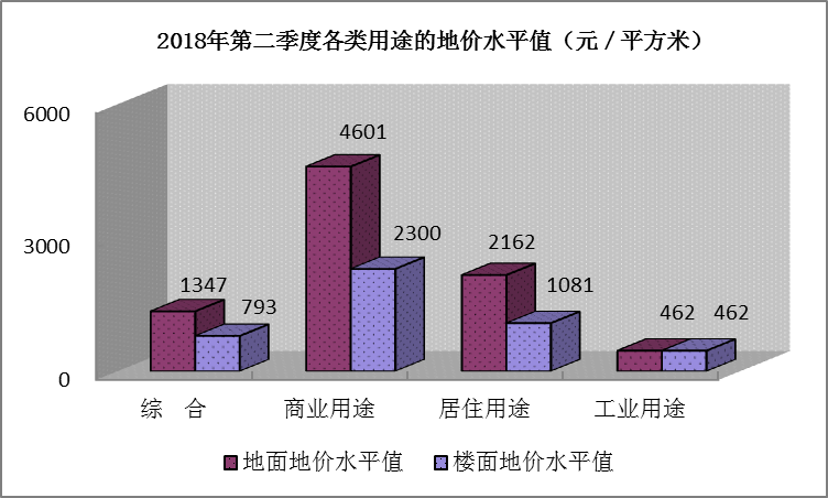 湛江市2018年第二季度商业、居住、工业用途的楼面地价水平值分别为2300元/平方米、1081元/平方米、462元/平方米。地面地价水平值分别为4601元/平方米、2162元/平方米、462元/平方米。