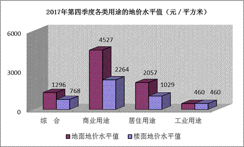 湛江市2017年第四季度商业、居住、工业用途的楼面地价水平值分别为2264元/平方米、1029元/平方米、460元/平方米。地面地价水平值分别为4527元/平方米、2057元/平方米、460元/平方米。