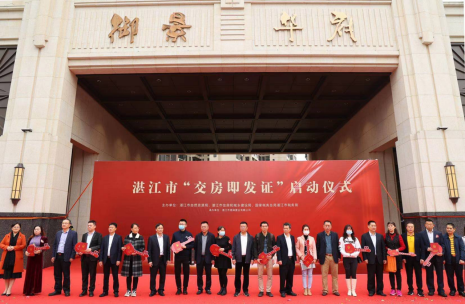 2021年1月25日上午,湛江市新建商品房“交房即交证”启动仪式在御景华府住宅小区举行,湛江市自然资源局党组书记、局长吴松江、湛江市税务局党委副书记(主持全面工作)、广东省税务局第四税务分局副局长(主持全面工作) 蒙全忠、湛江市住房和城乡建设局副局长莫大成等单位相关领导参加仪式。
