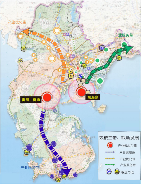 抓住海南自贸港建设的重大机遇,支持建设雷州经济开发区,着力推进“一区三园、一中心三基地”建设,重点发展智能汽车、智能家电、高端装备制造、新一代电子信息、先进材料、绿色能源等产业。