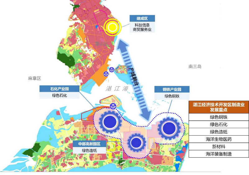 充分发挥湛江经开区临港优势,重点发展绿色钢铁、绿色石化、绿色造纸、海洋生物医药、新材料、海洋装备制造等产业,做大做强临港产业集群。