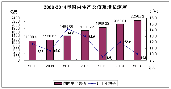 初步核算,2014年实现生产总值(GDP)2258.72亿元,比上年增长10.0%。其中,第一产业增加值447.96亿元,增长4.3%,对GDP增长贡献率为7.6%;第二产业增加值895.95亿元,增长11.3%,对GDP增长贡献率为45.9%;第三产业增加值914.82亿元,增长11.2%,对GDP增长贡献率为46.5%。三次产业结构19.8﹕39.7﹕40.5。在第三产业中,交通运输、仓储和邮政业增长4.4%,批发和零售业增长19.9%,住宿和餐饮业增长5.4%,金融业增长26.3%,房地产业增长4.9%,其他服务业增长10.7%。在现代产业中,高技术制造业增加值增长25.5%;先进制造业增加值增长1.3%;现代服务业增加值增长11.5%。民营经济增加值1439.51亿元,比上年增长13.0%。全市人均GDP达到3.14万元,比上年增长9.2%。